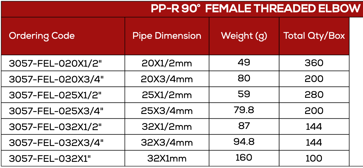 Previous Product Next Product PP-R 90° Female Threaded Elbow Product Description – PP-R 90° Female Threaded Elbow Model Number – BT 3057 SKU: BT 3057 Category: PPR Fittings Dimensions Related products Quick View Quick View PPR FittingsPPR 45*c Elbow Read more Quick View Quick View PPR FittingsPP-R Male Threaded Adapter Read more Quick View Quick View PPR FittingsPP-R TEE With Side Inlet Read more