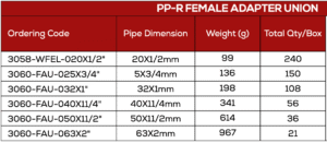 Previous Product Next Product PP-R Female Adapter Union Product Description – PP-R Female Adapter Union Model Number – BT 3058 SKU: BT 3058 Category: PPR Fittings Dimensions Related products Quick View Quick View PPR FittingsPP-R Flange Socket Read more Quick View Quick View PPR FittingsPipe Cap Read more Quick View Quick View PPR FittingsReducing Socket Read more