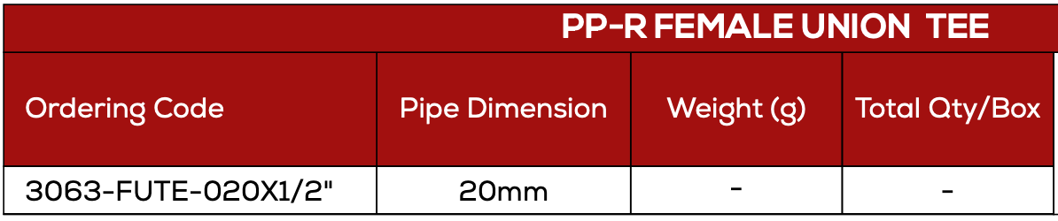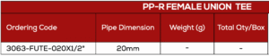 Previous Product Next Product PP-R Female Union TEE Product Description – PP-R Female Union TEE Model Number – BT 3063 SKU: BT 3063 Category: PPR Fittings Dimensions Related products Quick View Quick View PPR FittingsPP-R TEE With Side Inlet Read more Quick View Quick View PPR FittingsPP-R 90°Elbow FM Read more Quick View Quick View PPR FittingsPPR 90*C Elbow Read more